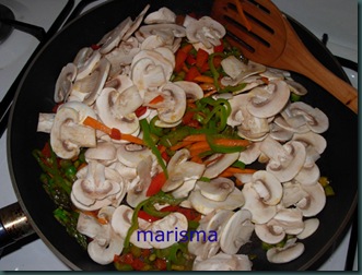 Lavamos bien los champis de tierra y les cortamos el pedúnculo. los hacemos láminas y los rociamos con unas gotas de limón para que no se pongan negros. En una sartén amplia o wok, ponemos un chorrito de aceite y cuando esté caliente ponemos el pimiento rojo, el verde cortado en rodajas muy finas y la zanahoria cortada a tiritas finas.
