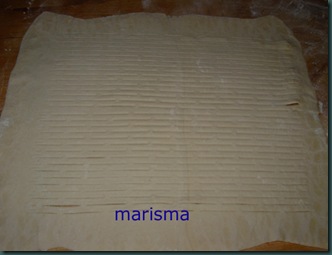 ahora ponemos la otra placa en la encimera y después de estirarla bien, pasamos el rodillo de enrejado firmemente con el fin de que taladre bien.
