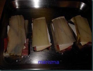 Ponemos las pencas en el escurridor y las cortamos por la mitad. En una fuente para horno, ponemos en el fondo un chorrito de aceite de oliva, encima cuatro trozos de penca, encima la loncha de jamón serrano, ahora dos triángulos de queso curado,