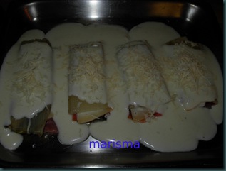 Ahora preparamos una bechamel clarita, esto quiere decir que no la haremos tan espesa como si fuese para croquetas. Se consigue simplemente añadiendo más leche. Cuando ya tengamos la bechamel lista la vertemos sobre las pencas y espolvoreamos de queso curado rallado.